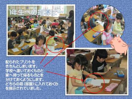 教室で様子を見ていると,「配られたプリントを折りたたんでしまう。」ということだけにも,慎重な指導が必要なことが分かります。そのプリントは学校で使うのか,それとも家に持って帰るのか。担任は,机の中へのしまい方を変えて(入れる箱を変えて)指導していました。指示の仕方が異なるところがポイントです。
