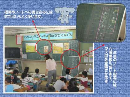 次に,ノート指導です。ノートにはマス目がありますから,黒板の字を書き写す際には,方眼黒板をもとに書き出し等について説明をする必要があります。