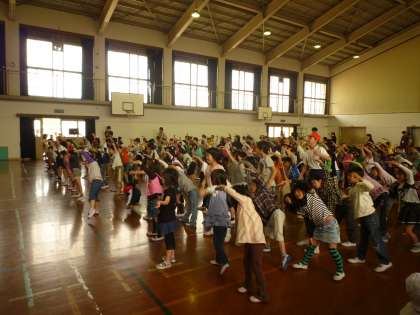 休み時間に1・2・3年生が,運動会の準備体操(全校ダンス)の練習をしました。