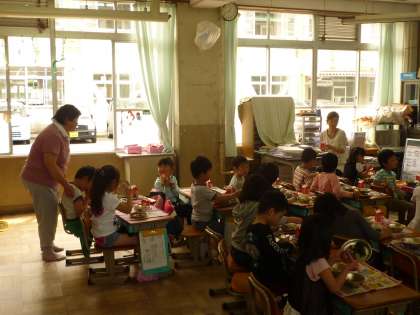 子どもたちは,給食調理員さんとたくさん会話をしながら楽しく食べていました。