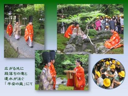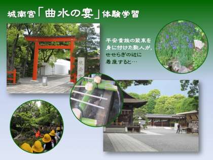 本日,校区内にあります城南宮様のご協力により,6年生の子どもたちは,「曲水の宴」を見学し,その解説を聞かせて頂くことができました。子どもたちの目の前で,平安貴族の優雅な遊びを実演して頂いた訳です。社会科の「平安時代の文化」の学習,国語科の「和歌(短歌)」の学習に大いに役立ちました。