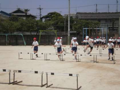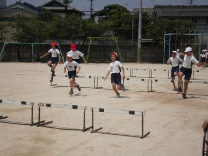 今日は,ハードル走の練習をしました。歩幅を合わせることを意識しながら,何度も練習しました。5年になり,初めてハードル走をしましたが,みんな上手に飛び越えることができていました。