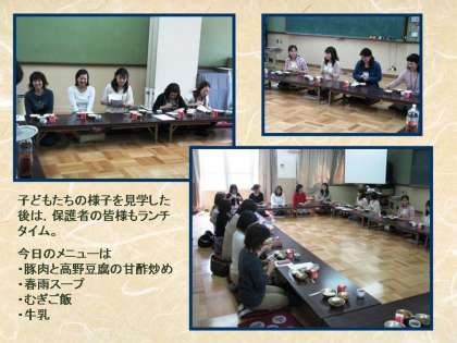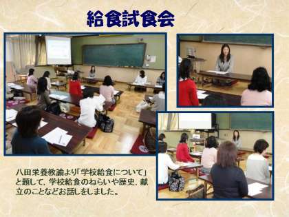 今日は,給食試食会を行いました。試食会には,1年生の保護者の方とPTA本部役員を合わせ23名の保護者の皆様が参加されました。先ず給食試食会では,八田久美子栄養教諭より約1時間学校給食について説明をしました。八田教諭は,週1回ですが今年度より下鳥羽校で勤務しており,子どもたちに食について指導をしています。説明の中では,学校給食のねらいや歴史,献立ができるまでの過程,給食の調理法工夫や手作りで作っている様子,そして,子どもたちの給食時間の様子など説明しました。