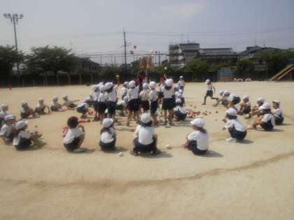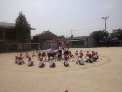 今は、外で入場して円になり、玉入れをする練習をしています。笛の合図で立って、玉入れをし、終りの合図を守れるように練習を重ねています。