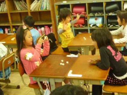 隣の席の子とペアを組み,互いに数図ブロックを使って問題を出し合いました。