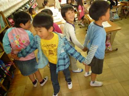 グループで手をつなぎ,音楽に合わせて反対側へ向きを変えようとしていましたが,