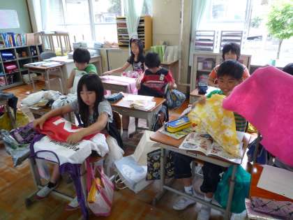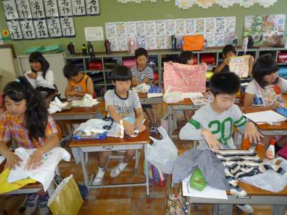 それぞれが家から持ってきた,着なくなった服や靴下,使わなくなった布やボタンなどを材料に,どんな生き物を作ろうか考えています。保護者の皆様,ご準備ありがとうございます。