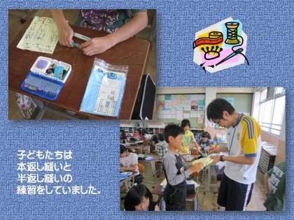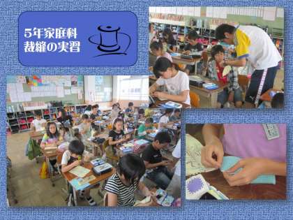 5年生は,家庭科の授業で裁縫をしています。今日は,「返し縫い」の基本を練習していました。運針用の布でくり返し縫っていました。これがうまくできたら,エプロンなどの作品づくりに取り組むことができますね。家でも練習してみましょう!