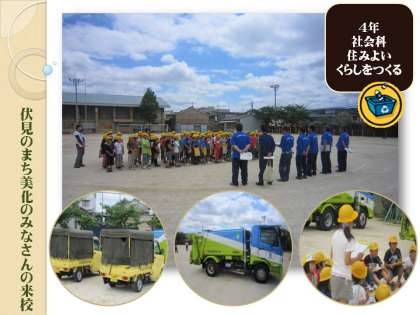 4年の社会科学習は「ごみのしょりと利用」の単元に入りました。家から出たごみは,どのように収集されるのかに,まず疑問をもった子どもたちは,今日,来校して頂いた『伏見まち美化事務所』のみなさんからお話を聞きました。
