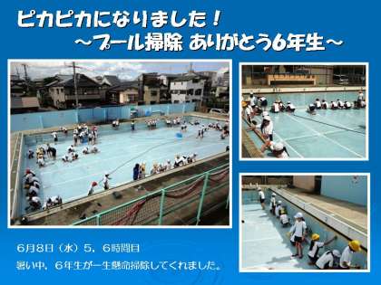 梅雨の晴れ間。今日8日(水)の午後,6年生がたわしを使いながら,プールを丁寧に磨いてくれました。その甲斐あってプールはピカピカに。
