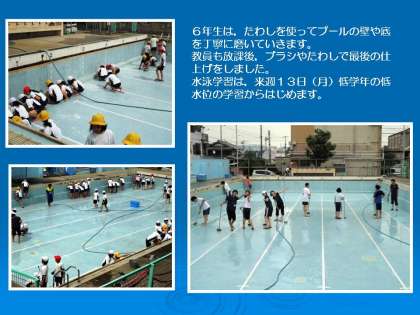 水泳学習は,来週13日(月)から始まります。最初は低水位なので,低学年が学習します。週の後半には高学年の水泳学習が始まるでしょう。
