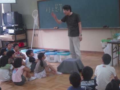 本日2,3校時に京都教育大学の村上忠幸教授をお招きし,出前授業をしていただきました。授業の内容は,「アゲハチョウのオス・メスの見分け方」「アゲハチョウの成虫にえさをあげる方法」「アゲハチョウはどのようにして,みかんの葉っぱを見分けて卵を産むのか。」というものです。