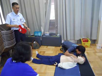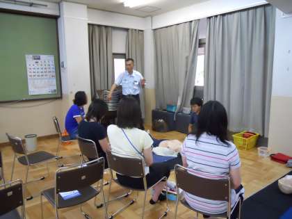 6月14日(火)応急手当の方法について研修をしました。「倒れている人を発見した!その時あなたはどうしますか?」伏見消防署の署員さんの問いかけで研修が始まりました。心肺蘇生のポイントは「1に胸骨圧迫、2に人工呼吸、3にAEDです」さっそく実習です。一人で,二人一組で・・・約1時間30分間・・・みんな真剣に取り組みました。「ためらわずに勇気を持って応急手当てをしてくださいね!」署員さんの最後の言葉に私たち一同気持ちを新たにしました。プール指導が始まりました。気持ちを引き締めて安全指導に取り組みたいと思います。
