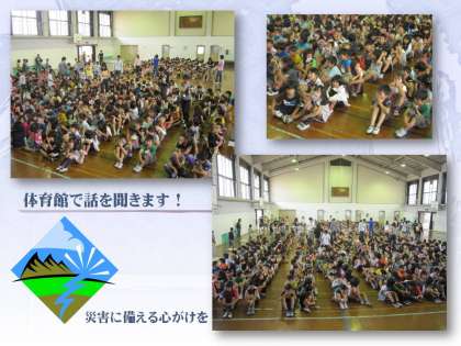 延期になっていた避難訓練。今日もあいにくの天候だったのですが,防災教育として重要な役割のある活動「避難訓練」をこれ以上遅らせる訳にはいかず,体育館に子どもが集合することにして,本日の9時35分から訓練を開始しました。