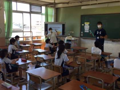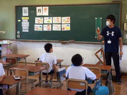 自己紹介をし,日付や天候など,教師の発音・発声やジェスチャーをよく見ながら慣れ親しんでいました。