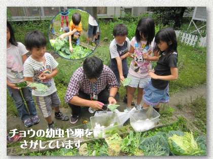 モンシロチョウの卵や幼虫を見つけようと,昨年度から育ててもらっていたキャベツ畑を探ってみました。アオムシがいました。白い小さな卵がありました。これからチョウになるまで育てていきます。どんなふうに育っていくのでしょうか。みんなで観察していこうと思います。