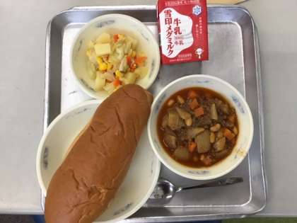 本日の献立は「やさいのホットマリネ・ぎゅうにゅう・こくとうコッペパン・チリコンカーン」です。やさいのホットマリネはいろどりも良く,目で見ても楽しめました☆