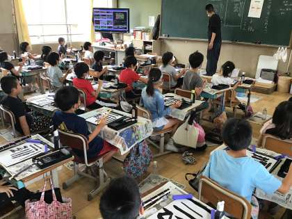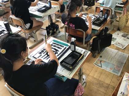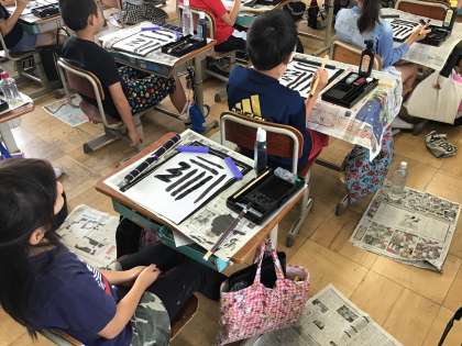 書写のはじめの学習では,「毛筆用具の名前やおき方・あつかい方」も学んでいました。力の入れ方(筆圧)を変えながら太さの違う線をかいたり,筆のやわらかさをたしかめながら,曲げたり・はらったり・はねたりする感覚を楽しんでいました☆