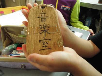 5ねんせいの きょうしつを はさんで,おんがくしつと ぼうさいそうこが あります。おんがくしつでは,いろいろな がっきをみて めを きらきらと させていました。