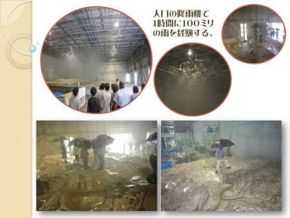 大切な学習と心して,体験見学をさせて頂きましたが,これは大変良い学習になりました。人口降雨機の下で,観測史上最大の雨なども経験させて頂きました。上流で大雨が降れば,中流域でも,川は大変な水量になることがよく分かりました。これは,私たちの校区では身近で切実な問題です。地域の皆様と一緒に,いろいろと感想を話させて頂きながらの研修でした。