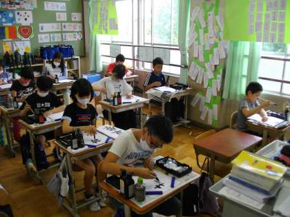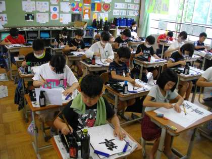 習字で「草原」を書きました。「原」の中と外の組み立て方に注意して取り組みました。