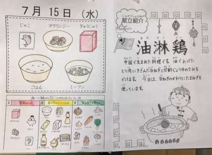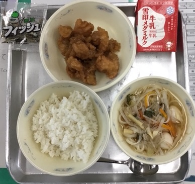 本日の献立は「じゃこ・ヨウリンジ—・ぎゅうにゅう・ごはん・ミーフン」です。中国料理だそうです。
