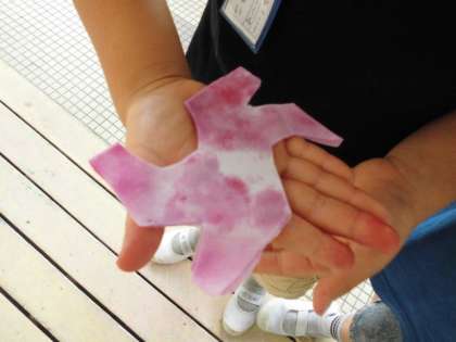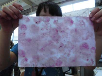 たいせつに そだててきた あさがおの はなを しぼって,わしを きれいな いろに そめました。