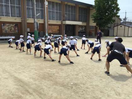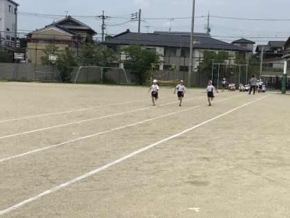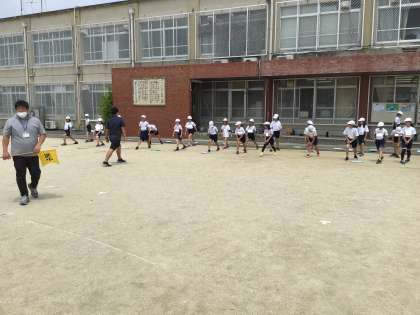日かげで準備運動をし,「よーい,ドン!!!」走り終わるとカードに記録していました!!
