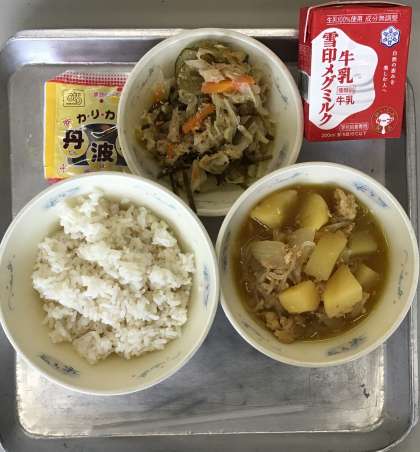 本日の献立は「くろだいず・ごまずに・ぎゅうにゅう・むぎごはん・じゃがいものそぼろに(カレーあじ)」です!!