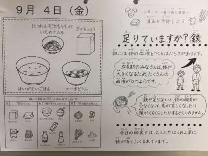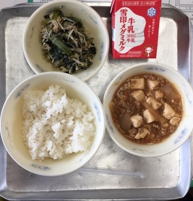 本日の献立は「ほうれんそうともやしのいためナムル・ぎゅうにゅう・はいがまいごはん・マーボどうふ」です。