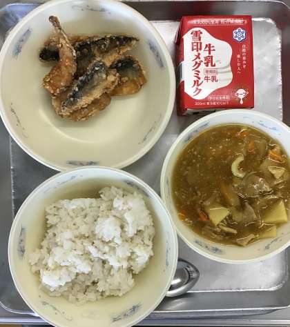 本日の献立は「とびうおのこはくあげ・ぎゅうにゅう・むぎごはん・カレーあんかけごはんのぐ」です。