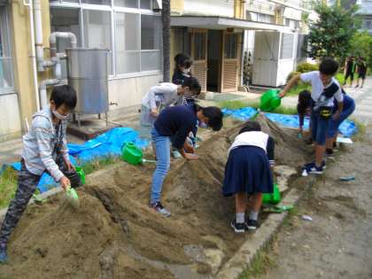 砂場で山を作って水を流しました。水の流れ方や働きについて観察実験をしました。分かったことをホワイトボードにまとめていました。
