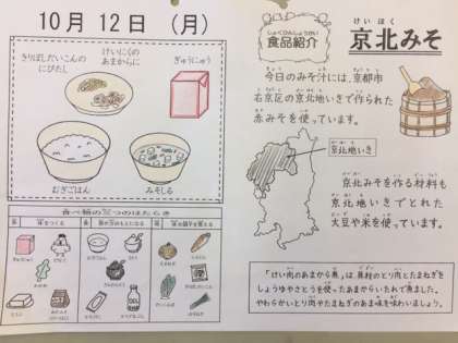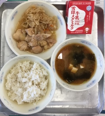 本日の献立は「きりぼしだいこんのにびたし・けいにくのあまからに・ぎゅうにゅう・むぎごはん・みそしる」です。