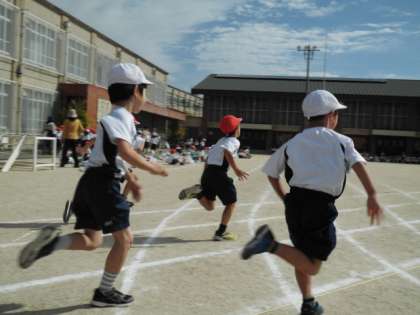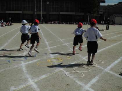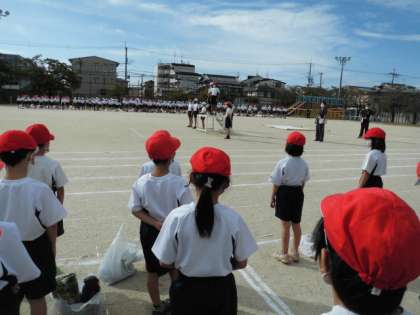 きょうは,あきばれのもと,いちねんせいは はじめての たいいくこうりゅうかいを けいけんしました。