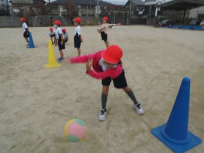 こんかいは,いろいろな ころがしかたで ボールを まとに あてる れんしゅうをしました。