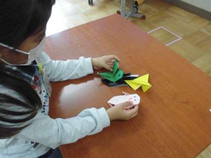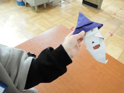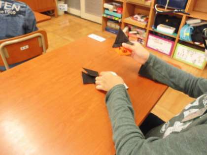 ハロウィンをテーマにした作品作りにも取り組んでいて,今日は折り紙で「おばけ」と「こうもり」を作りました。