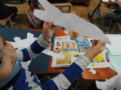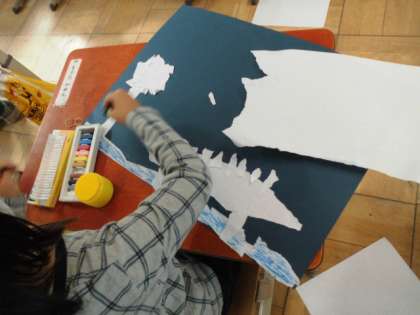 ずこうの 学しゅうでは,「やういたかたちから」で かみを いろいろに やぶいてできる かたちから そうぞうして いろいろな せかいを あらわしました。
