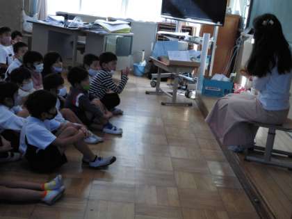 ちいきのかたが あさに よみきかせに きてくださって,たのしい おはなしを きくことができました。