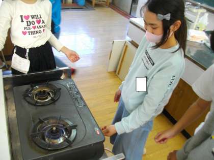 ガスコンロの点火と消火の練習を一人ずつ行いました。