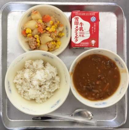 本日の献立は「さっぱりツナポテト、牛乳、麦ごはん、ハッシュドビーフ」です。