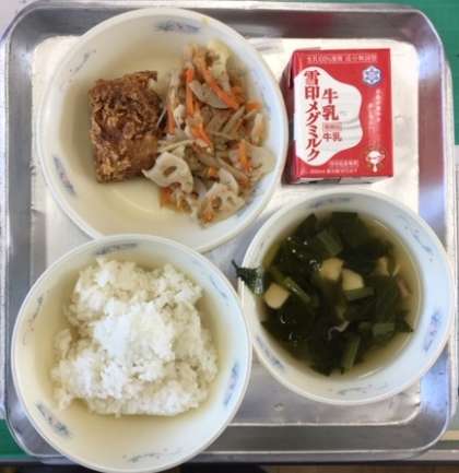本日の献立は「根菜のごま炒め・さばのたつたあげ・牛乳・ごはん・すまし汁」です。