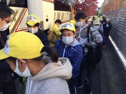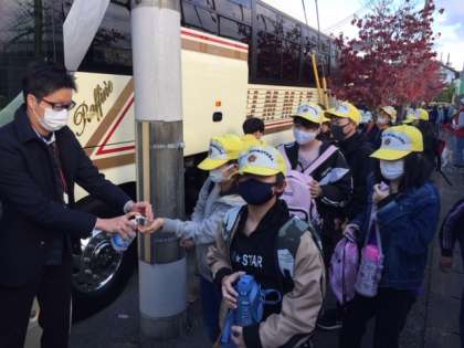 健康観察,検温,アルコール消毒,マスク着用と新型コロナ感染防止対策を講じながらバスに乗り込みました!多くの保護者・教職員に見送られ,いざ,出発☆