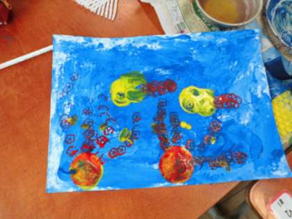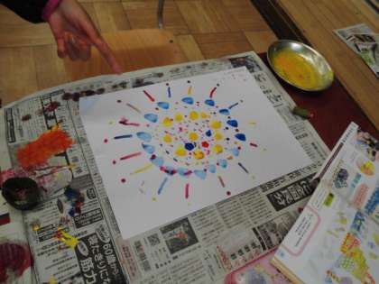 ずこうでは,いろいろな かたちを つかって,すたんぷの さくひんを つくりました。