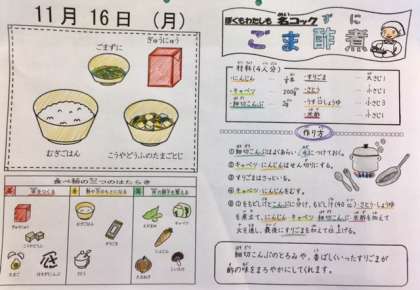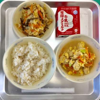 本日の献立は「ごまずに・牛乳・麦ごはん・こうやどうふのたまごとじ」です。