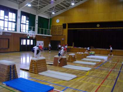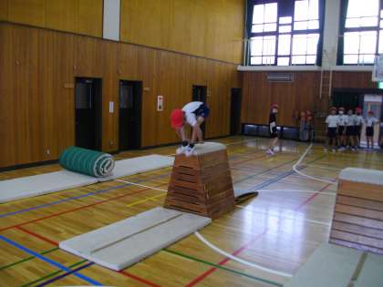 体育でとび箱運動をしています。いろいろな技を挑戦しています。