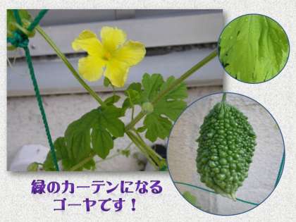 「緑のカーテン」として育てている,給食室横のゴーヤもだんだん育ってきて,小さな実が付き始めましたよ。中庭ではムクゲの花がいっぱいに咲いています。
