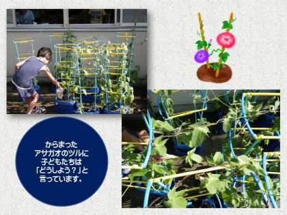1年生の子どもが呼んでいるので,かけつけてみると,アサガオのツルが,友だちが育てている,となりの鉢の支柱にからまってしまって,とれないのだそうです。さてどうしましょうか?