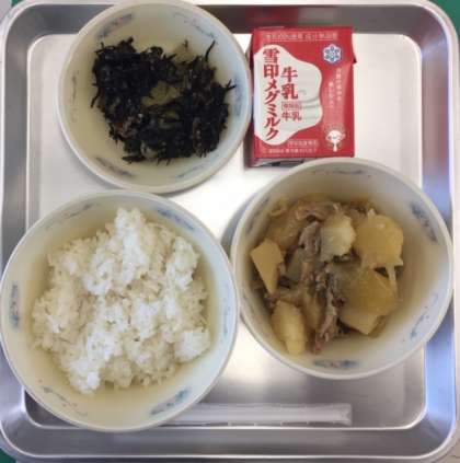 本日の献立は「こまつなとひじきのいためもの・ぎゅうにゅう・ごはん・にくじゃが(カレーあじ)」です。