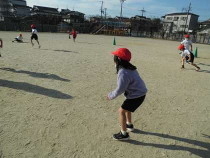 たいいくの 学しゅうでは,うんどうじょうで おにごっこあそびを おこないました。