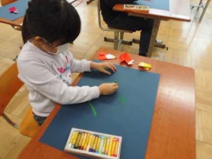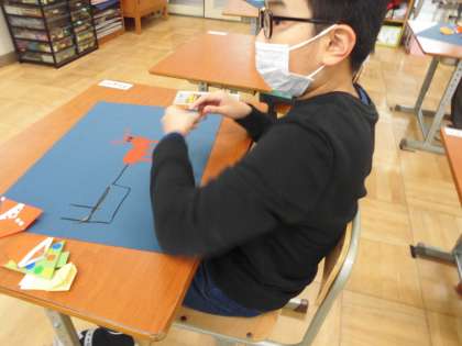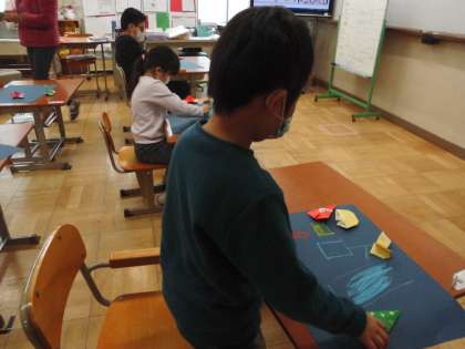 今日は,折り紙で作っていたクリスマスの飾りを画用紙に貼り,一枚の作品にしました。